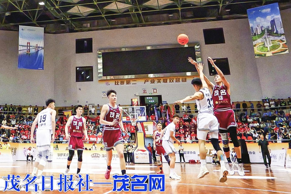 茂名队12号球员李春明(右)在进攻端迎着防守,跃起完成投篮。茂名日报社全媒体记者 张波 摄