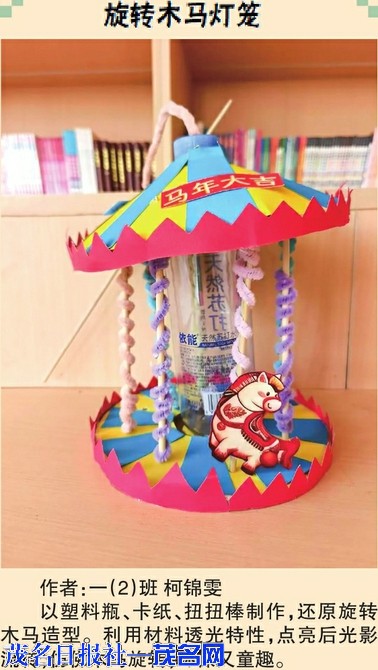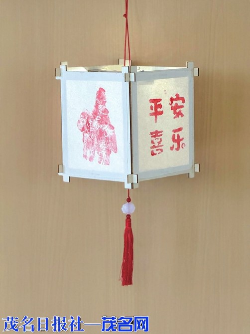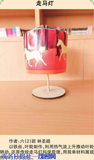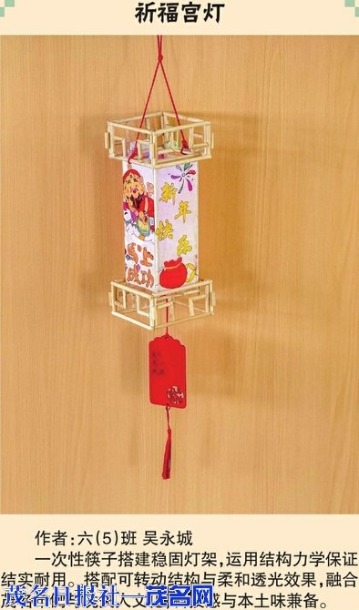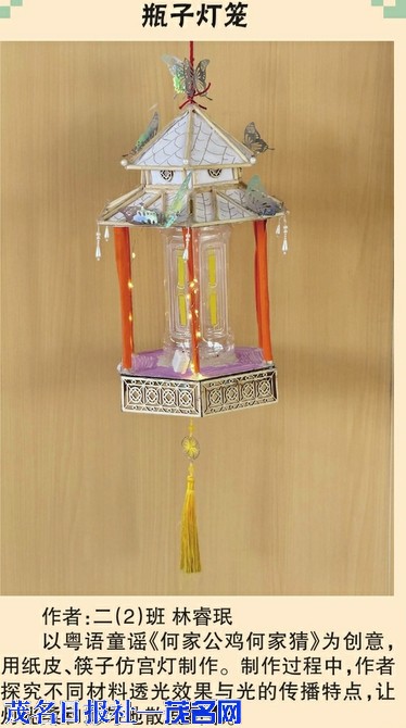 光影拓印灯 作者:三(5)班姜文杰木条骨架搭配废旧纸面,融入冼夫人非遗拓印图案。运用光沿直线传播原理,点亮后可将图案与文字投射地面,非遗与光学巧妙融合。