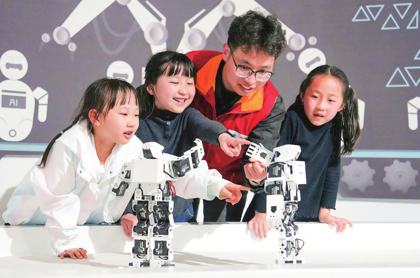 4月2日,志愿者带托管班孩子在江苏省海安市科技馆观看机器人表演。 新华社发(周强 摄)