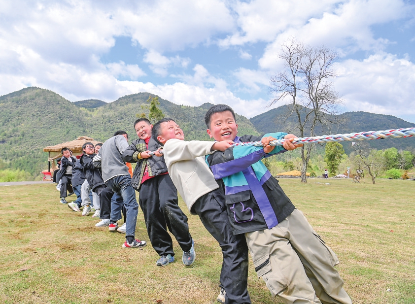 4月3日,孩子们在重庆市酉阳土家族苗族自治县叠石花谷景区参加趣味拔河活动。 新华社发(冉川 摄)