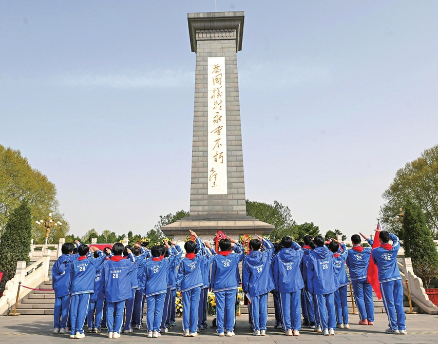 4月5日,在位于河北省石家庄市的华北军区烈士陵园,石家庄市第二十八中学学生开展祭奠英烈活动。 新华社发(陈其保 摄)