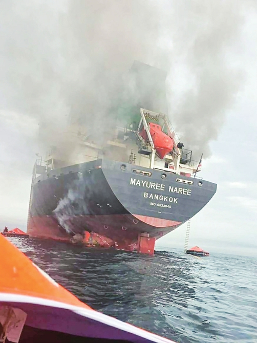 这张泰国海军3月11日发布的照片显示,一艘泰国货船在霍尔木兹海峡海域遭袭起火。新华社发(泰国海军 供图)
