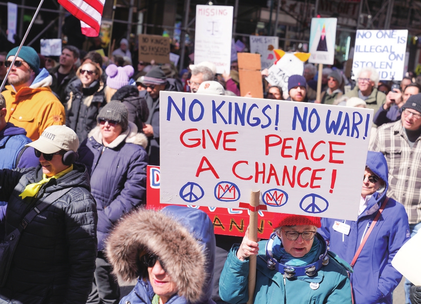 3月28日,人们在美国纽约参加“不要国王”抗议活动。前面这名抗议者手举的牌子上写着:“不要国王!不要战争!给和平一个机会!”新华社记者 张凤国 摄