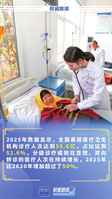 2025年,全国基层医疗卫生机构诊疗人次达到55.6亿,占比52.6%,基层诊疗人次和占比持续提升,分级诊疗成效显现。全国双向转诊的医疗人次也在持续增长,2025年比2020年增加超过了50%,群众上下转诊更加便捷。