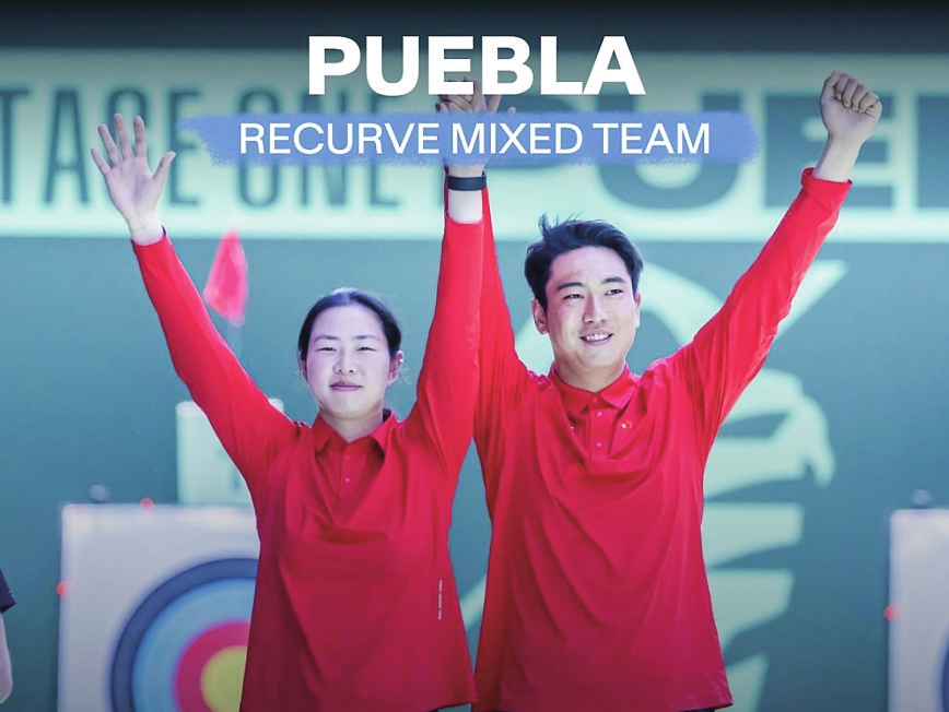 朱静怡(左)、孙景宣组成的中国队获得2026射箭世界杯墨西哥普埃布拉站反曲弓混合团体金牌。(图片来自国际射箭联合会官方社交媒体账号)