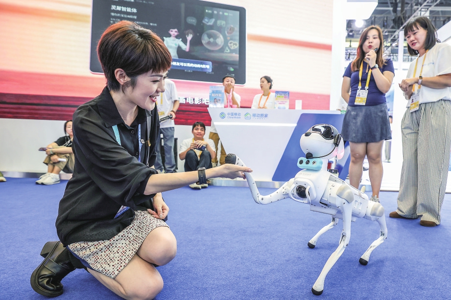 4月13日,参观者在第六届消博会现场跟机器狗握手。新华社记者 张丽芸 摄