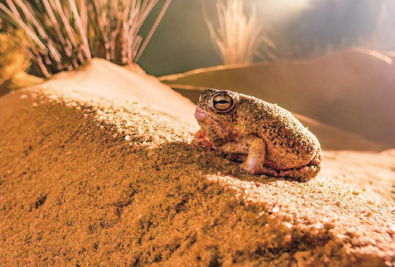 ◀沙漠雨蛙栖息于非洲南部干旱荒漠。为适应极端环境,它从不在白天活动,而是钻进沙洞避暑。水分来源很特别:主要吃白蚁,白蚁含水量高;还能通过腹部皮肤吸附雾水或沙土中的湿气,完成日常补水。