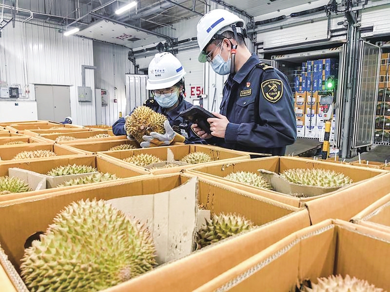 4月26日,南沙海关关员对进口鲜食榴莲进行监管查验。新华社发