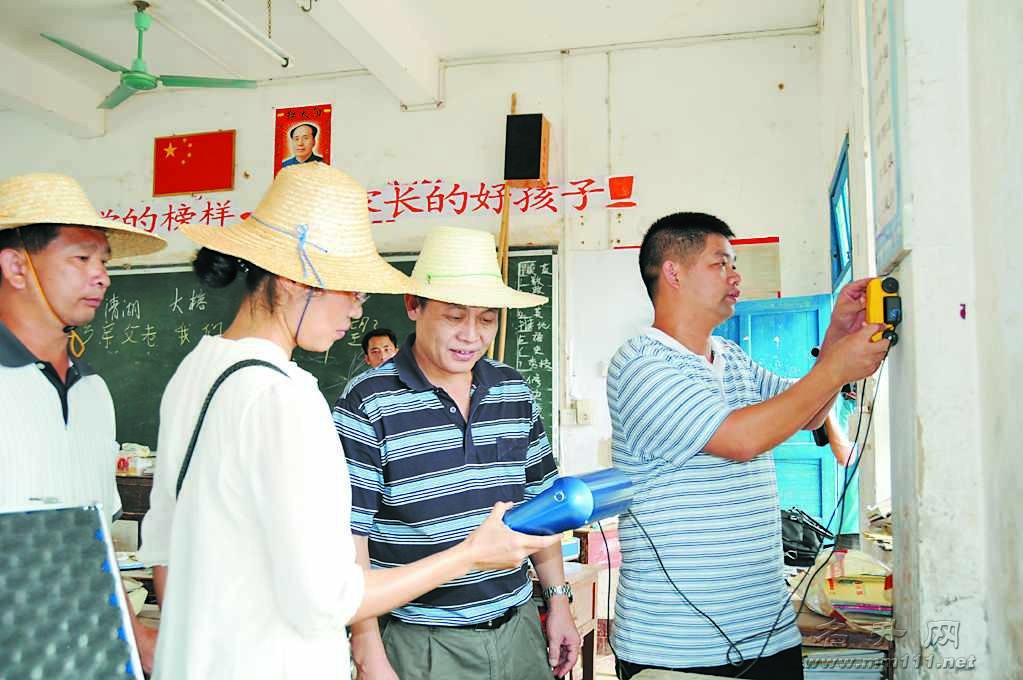 近日,高州市房地产管理局组成灾区房屋安全鉴定工作组,对马贵、大坡、古丁等镇房屋进行安全鉴定,避免灾区发生次生灾害。到目前止,该局先后出动了车辆40多车次、200多人对灾区30多个村委会200多幢房屋进行了安全鉴定,并为灾后重建提供重要依据。图为该局局长与工作人员一起为灾区鉴定房屋。 本报记者朱焕摄