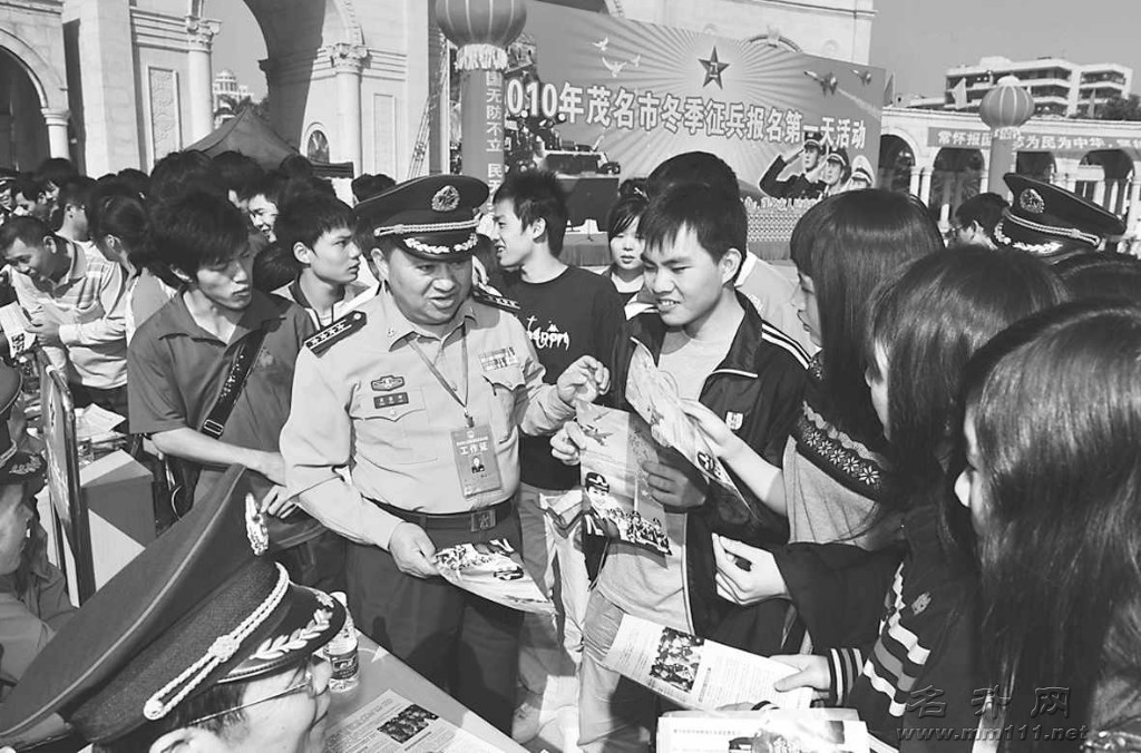 本报讯 昨天上午,市区人民广场锣鼓喧天,热闹非凡,我市在这里举行2010年冬季征兵报名第一天活动,现场516名适龄青年怀着成为军人的梦想,踊跃咨询应征相关问题,并在报名表上填上自己的名字。茂名军分区司令员周慎坤,市征兵办主任、茂名军分区参谋长洪永秋等出席活动,鼓励热血青年报名应征。 在报名活动现场,周慎坤、洪永秋与部分参加报名的适龄青年交谈,鼓励他们积极报名应征。适龄应征青年围着报名、咨询、体检、政审等服务点,咨询身体条件及入伍去向等各种问题,市征兵办公室工作人员热情为前来应征的热血青年和群众解答,并为在场群众发放征兵宣传资料。 据悉,今年冬季征兵不鼓励征集在校生,主体对象是2010年各级各类本科、大专、高中(含职高、中专、技校)院校应届毕业生,优先征集学历高的青年和应届毕业生入伍。各级各类本科、大专院校学校完成专业课程学习后,参加实习至次年毕业的大三学生可以作为毕业班学生在今年冬季入伍,在6月底前在就学学校完成兵役登记和预征对象确定工作,户口在学校所在地的,年底由学校所在地县(市、区)征兵办公室统一组织体检政审和批准入伍,服兵役可以视为实习,按照学校的规定完成毕业论文(设计)和答辩的,可以获得毕业证书和学位。同时,大三学生也可以作为在校大学生入伍,服役完成后复学继续完成学业。 (许巨滔 陈牧云 熊永福)