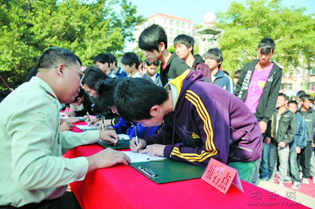 昨日上午,信宜市淘金湾广场锣鼓喧天,信宜征兵办在这里举行2010年度冬季征兵活动,青年们热情高涨,踊跃报名,场面十分热闹。截至目前,已经有1100余名适龄青年报名应征。 记者 于双利 通讯员 谢志艺 摄
