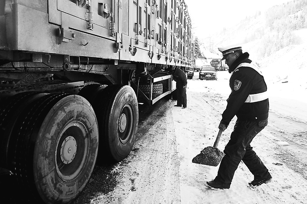 10月25日,新疆哈密省道303线,交警为过路的打滑车辆垫防滑沙。 10月24日起,受冷空气入侵影响,新疆哈密北部出现降雪降温和大雾天气,省道303线部分路段出现积雪、结冰和大雾天气,能见度下降,当地交通部门积极采取应急措施,清除路面积雪结冰,实施交通管制,疏导道路交通,确保道路安全畅通。 新华社发(蔡增乐 摄)
