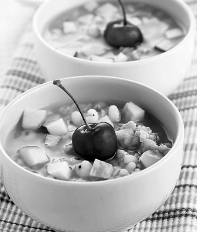 今天为大家介绍的燕麦薏米水果糖水,既营养美味,还能解渴饱腹,一举多得,值得尝试。 近几年来,燕麦成为人们口中非常有口碑的营养健康食品,还被美国《时代杂志》 选为10大 超级食物之一,因为燕麦里有一种被称为β聚葡萄糖的可溶性纤维,能在肠内黏住食物中的胆固醇,这种黏性的凝状体不会被身体吸收,通过肠道时会带走不需要的胆固醇, 因此可以降低 胆固醇;另外燕麦中的可溶性纤维在肠内建立一层保护膜,减少碳水化合物吸收率,因此能维持血糖稳定。 燕麦通常会用来做麦片粥,市面也有很多焙制好的干燥燕麦片,泡在牛奶中做早餐,另外还有燕麦面包。不过令很多人困扰的是,燕麦口感粗糙,感觉像在吃饲料,其实这种感觉非常到位,因为燕麦在几百年前的英国曾被定义为“在英格兰通常用来喂马”。因此在烹煮燕麦前,最好先浸泡,让其变软,煮时最好加些其他材料,如牛奶、各种豆子、水果、果干等,口感更为丰富,营养也更全面。当然市面上 还有即 食燕麦和快熟燕麦,食用起来非常方便。 3-4人份 做法: 1.燕麦洗净,提前一晚浸泡;薏米洗净,冷水浸泡两小时,捞起备用; 2.苹果、番石榴和菠萝分别切成丁备用; 3.将泡好的燕麦和薏米倒入煲内,加入8碗水煮沸,用小火煮约一个小时; 4. 加入冰糖再煮10分钟,搅拌均匀即可熄火; 5、放入所有水果丁拌匀,待糖水冷却放入冰箱冷藏后即可,食用时装碗用樱桃点缀。 功效: 健脾利水、排毒减肥、滋润美颜。 ●靓汤心水●超市还有压扁的燕麦片供选择,这种麦片较麦仁易煮开,提前两三个小时浸泡即可。 材料: 樱桃:6粒菠 萝肉:1/4个 苹果:1个 番石榴:1个 燕麦仁:50克薏 米:100克水 :8碗