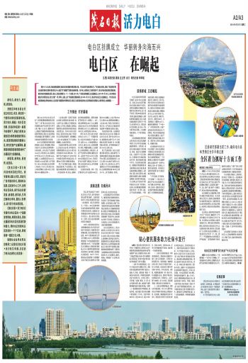 刊首语新电白,新活力,新征程,新发展。茂港区和电白县合并设立电白区,电白,将迎来一个前所未有的发展新机遇。活力电白,崛起!电白区在市委、市政府和区新一届班子的领导下,将奋力把电白建设成为粤西县域经济排头兵、湛茂阳临港经济圈核心区、特色优势产业集聚地、国家级滨海旅游度假胜地和广东最具活力滨海新城。新版面,新阵地,强宣传,促发展。《茂名日报活力电白》应电白区成立而生。该专版将以图文并茂、深度与广度并重的形式,围绕电白区委、区政府中心工作,宣传电白区各地、各行各业的新发展、新成就、新风尚,引导正确舆论导向,服务人民群众,助力活力电白新发展。《茂名日报.活力电白 》专版作为电白区的一个重要宣传阵地,将面向茂名、面向全国展示电白区的发展优势和潜力,同时也记录着电白区发展的一个个足迹,奉给读者一道道文化大餐。敬请社会各界共同关注每周二出版的《茂名日报活力电白》专版,关注活力电白这块热土的发展! 党的十八大以来,推动新型城镇化建设成为我国新时期发展大势。作为改革开放的领头羊,广东省结合实际,提出了促进粤东西北地级市振兴发展和粤东西北中心城区“扩容提质”发展的战略构想。在中央、省委的大力指导支持下,茂名开始实施滨海发展战略,谋划向东向南靠海发展,茂名人民的滨海梦正一个一个实现:2012年,广东茂名滨海新区正式挂牌成立;2014年4月16日,水东湾综合整治开发项目启动,致力打造“一带、两环、五廊、五片”的滨海发展新格局;2014年4月18日,茂名市电白区正式挂牌成立。作为茂名实施滨海战略主阵地的电白,在实现扩容提质的华丽转身后,现在正以崭新的姿态屹立在滨海建设发展潮头,阔步前进,加速崛起…… 工作推进 打好基础 茂港、电白合并设立电白区后,带给广大市民最直观的感受就是茂名市区“变大”了。据了解,设立电白区后,茂名市区面积从886平方公里扩至2715平方公里,户籍人口从136万人增加到280万人,使城区扩容提质获得实质性的突破。而经济学家则说,茂港、电白各自拥有良好的发展基础,现在“强强联合”,必将为未来的城市发展提供更有力的支撑。 2013年,原茂港区经济发展实现突破性增长,综合实力明显增强,取得全市各县(市、区)经济社会发展考核第一名的好成绩。去年全区生产总值实现146.66亿元,同比增长14.2%;完成固定资产投资63.01亿元,同比增长65.4%;规模以上工业增加值实现45.66亿元,同比增长34.2%;城市居民人均可支配收入15424元,同比增长12%;农村居民人均纯收入11100元,同比增长20%。公共财政预算收入完成5.02亿元,同比增长55.0%,增幅居全市第一。 工业方面,按照“一园多区”的思路全力推进工业园区建设,做大做强一批工业骨干企业,信翼化工已向国家证监会提出上市申请,长晟油脂、昌利海运物流两家企业经省经信委批复为高成长性民营企业。另外有23家中小型民营企业,经过技术改造,提高了市场竞争力,经济效益明显提升。新增规模以上企业10家,超额完成了市下达新增4家规模以上企业的目标任务。 农业经济发展平稳,全区共有市级以上农业龙头企业8家,其中省级3家,发展新增省级龙头企业1家,农民专业合作组织共有186家,新增45家。无公害农产品生产基地达22个,获2013年度中央财政小型农田水利重点县(区),争取到800万元农田水利建设补助资金。 第三产业发展势头迅猛。滨海旅游业是该区第三产业发展亮点。该区整合滨海旅游资源,依托滨海绿道,进一步优化美化第一滩、虎头山、晏镜岭、童子湾等滨海景观景点。景观“滨海绿道”获得茂名市十大景观之一。去年,该区共接待游客达205.1万人次,旅游综合收益19486.5万元,其中茂名滨海公园接待游客达200万人次,旅游综合收益19000万元,分别同比增长13%和16%。 同样,2013年,原电白县社会经济发展也向人民交上了一 份满意的答卷。该县全年完成地区生产总值345.5亿元,增长13.1%。公共财政预算收入12.59亿元,增长24.12%,公共财政预算收入实现三年翻番;规模以上工业增加值、公共财政预算收入、税收总收入、房地产开发投资等4项指标总量排在全市第一;固定资产投资110.15亿元,增长58.9%,首次超过百亿元大关。举办第三届“电白向前进”主题活动,引进225个项目,协议总投资380亿元,其中投资额超亿元的项目70个。 工业经济加速发展。加快“一园五区”建设步伐,全年工业投资45.68亿元,增长92.9%,规模以上工业总产值187.82亿元,增长53.96%,新增和成长规模以上工业企业24家,外贸出口首次突破1亿美元大关。水产品加工出口基地成为茂名地区唯一被省政府认定的出口基地。 农业经济稳步发展。全县新增省级重点农业龙头企业2家、市级重点农业龙头企 业2家、农民专业合作社122家,创建省级农业名牌产品11个,沙琅镇被认定为第三批全国一村一品(龟鳖养殖)示范村镇。全年农林牧渔业总产值121.46亿元,增长3.5%。 第三产业加快发展。冼太夫人故里景区首期工程已竣工,沉香山被评为广东省森林生态旅游示范基地,御水古温泉被评为4A景区,全县实现旅游总收入14.8亿元,增长15.6%;房地产业投资31.0亿元,增长31.7%,占全市的40.1%,房产交易面积达81万平方米;商贸流通繁荣活跃,社会消费品零售总额128.32亿元,增长11.7%。三次产业结构进一步优化。水东湾新城