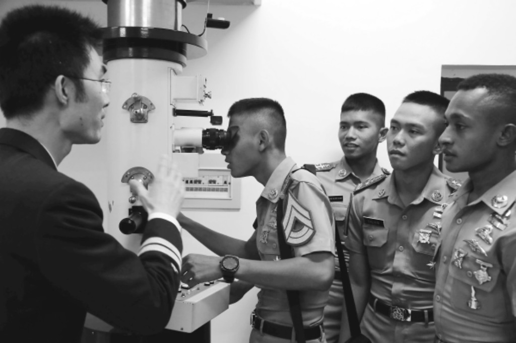 4月21日,印尼海军学员在我海军潜 艇学院潜艇仿真训练室参观。 当日,印尼海军学员代表团一行90余人参观我海军潜艇学院。印尼海军学员代表团随参加“海上合作—2014”多国海上联合演习的印尼“班加马辛”号船坞登陆舰,于4月20日抵达青岛。 新华社记者王建民摄
