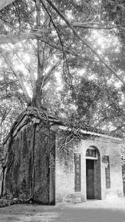 “我们村里社头的屋顶上长了一棵大树,有20多年了,树冠估计也有20多米宽。”15日上午,在名山街道名山下地村陈先生带领下,记者从车水马龙的一环路拐入一条狭长的小道,再下小坡,眼前遮天盖地的绿,一间用砖砌成的小屋屋顶上,长着一棵枝繁叶茂的大榕树。 整个屋顶生机勃勃 小屋是下地村的社头,除了大榕树,屋顶还有小叶榕、苦楝树等,显得生机勃勃。 走入屋内,房子两侧的墙体是黄沙墙,从屋顶梁柱上的文字依稀看到,社头是1980年重修的。陈先生摸着黄沙墙说,这两堵墙很坚硬,当年重建社头时,他们想把墙拆了用砖来重砌,可他们用鸡嘴锄来锄墙,不仅锄不动,墙体还起火花,所以墙体保留了下来。用砖砌好屋顶后,他们先在屋顶上铺了一层泥土,然后才涂水泥浆盖上瓦片。没想到,瓦片下的这层泥土会长出一棵参天榕树。 陈先生说,社头修好没几年,就长了这棵榕树。有村民担心榕树长大后会压坏屋顶,或被大风刮倒,提议将树砍了。但大部分村民反对,认为这是大自然的馈赠,他们要保护好,作为村里的文物古迹。 或是鸟儿的无心之作 令陈先生意外的是,春夏秋冬,屋顶上的榕树是四季常绿。仔细一看,屋顶上还有“树吞龙头”的景象。屋顶两端各“盘旋”着一条“龙”,生命力强大的榕树根不仅将“水泥龙头”吞掉,在斑驳的墙体上,还能看到如绿豆芽般新长出来的树根。黄沙墙上,随处可见的是榕树发达的网状根系,其中有两条大树根沿着墙体深深扎入地下。 陈先生猜想,估计是20多年前,有鸟儿在屋顶的龙头嬉戏,嘴里叼有榕树的种子,或者是鸟儿的排泄物里有榕树的种子。这些种子落在屋顶的泥里,于是长成了今天的参天大树。 玉林市科技局农村科技特派员、高级农艺师黄家南说,榕树的播种大多是靠鸟类来完成的,而且榕树易生长,一点点泥土,一棵榕树种子就能演绎出蓬勃的生命力。 村民担忧榕树压坏屋顶,黄家南说这也不无道理,为了避免榕树将屋顶压坏,最好的办法是,榕树根系发达,当树根长到地面时,可以适当培土,让根系扎入地下,以支撑屋顶上的榕树。 据玉林新闻网