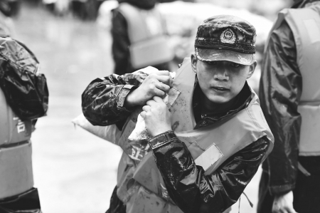 受连日强降雨影响,安徽省枞阳县汤沟镇白荡湖大稻圩水位暴涨,出现险情。武警合肥支队260多名官兵奔赴一线抢险救援,加固堤坝,使堤坝险情得到控制。 新华社发