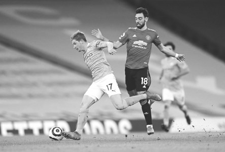 曼联队球员布洛诺·费尔南德斯(右)在比赛中和曼城队球员德布劳内拼抢。