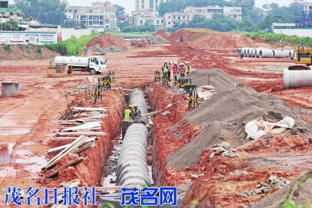 昨天,在市区东粤路(大园路至油城十路段)建设工地,施工人员正在进行排水管道施工,争取早日完成工程项目。
