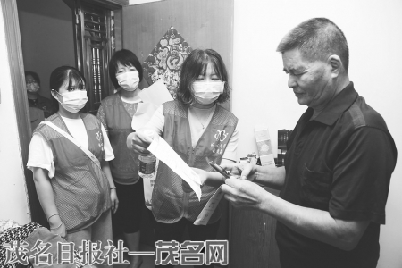 社区工作人员向居民派发宣传资料。茂名日报社全媒体记者李颜东摄