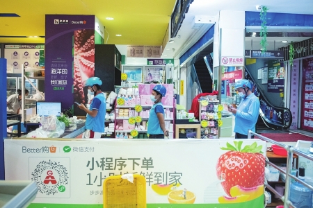 8月5日,在张家界市永定区步步高超市十字街店,外卖员排队提取市民订货。 近日,为应对当前疫情形势,湖南省张家界市多渠道积极调配物资,保障市场供应。据了解,目前当地粮油等生活物资储备充足、供应有序。 新华社记者陈思汗摄