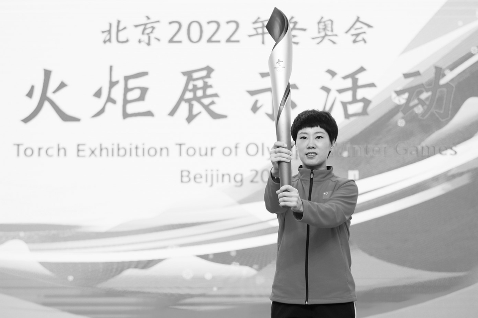 1月5日,冬奥会短道速滑冠军张会在活动现场手持火炬进行展示。 当日,北京2022年冬奥会火炬展示活动在黑龙江省哈尔滨市举行。本场活动结束后,冬奥火炬还将陆续在大庆、齐齐哈尔进行展示。 新华社记者张涛摄