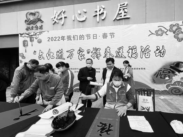 本报讯近日,高州市“2022年我们的节日·春节‘文化进万家’挥春送福活动”在高州市图书馆“好心书屋”门前举行。来自高州市各界名家和文化单位的书法家们即席挥毫泼墨,为广大市民书写春联,送上节日祝福。