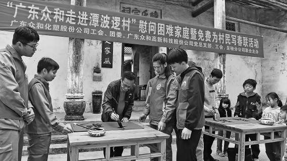 本报讯妙笔生花送祥瑞,翰墨留香迎新春。近日,广东众和高新科技股份公司呈驰分公司组织书法家、员工代表走进高新区七迳镇潭波逻村,为村民免费写春联,并慰问困难家庭,祝愿村民群众过上一个个暖暖的春节。