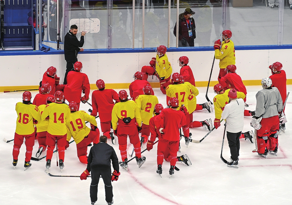 当日,中国男子冰球队在国家体育馆进行北京冬奥会赛前首场训练。 李紫恒摄