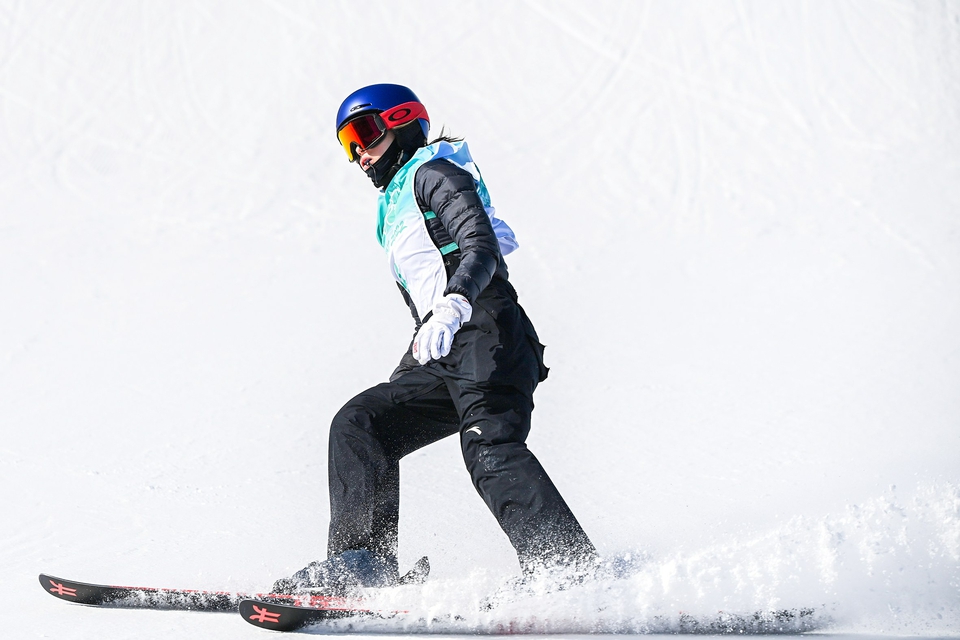 当日,中国选手谷爱凌在北京首钢滑雪大跳台进行赛前训练,备战即将开赛的自由式滑雪大跳台项目。