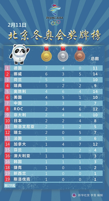 2月11日 北京冬奥会奖牌榜