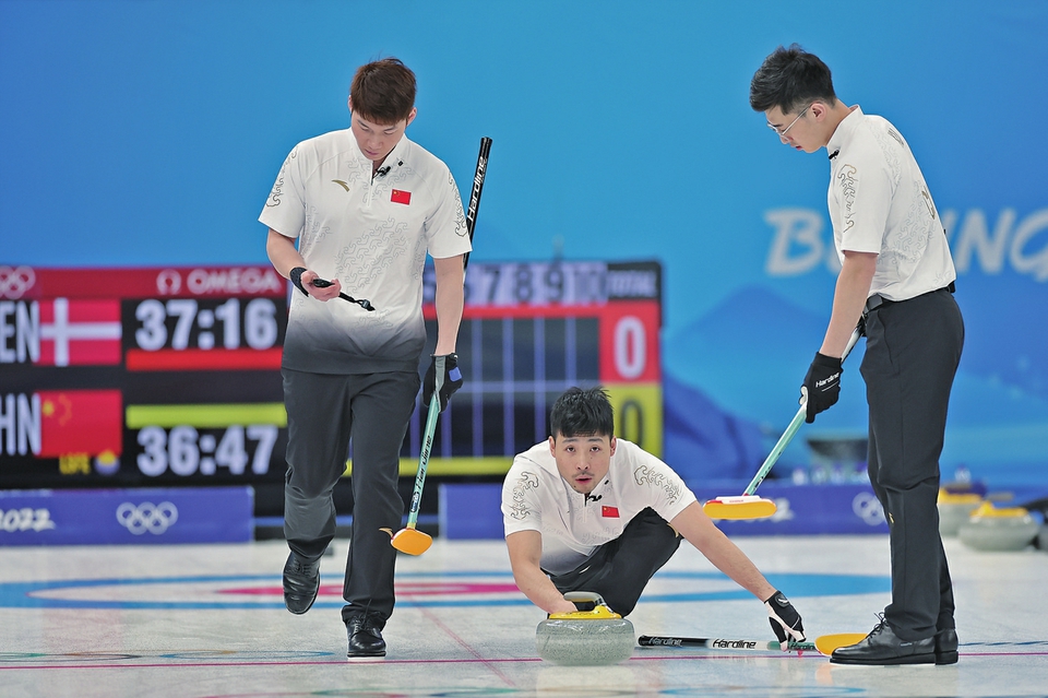 当天上午,中国男子冰壶队对阵丹麦队,双方在比赛中紧咬比分。比赛前四局,两队都是后手得1分。第五局,中国队最后一投成功分壶,后手拿到2分。此后三局,双方在后手局均得1分。第九局,双方均出现低级失误,中国队选择“流局”(双方在大本营内均无壶)保住第十局后手权。第十局,5: 4领先的中国队将局面简化,最终再度“流局”,保住胜果。