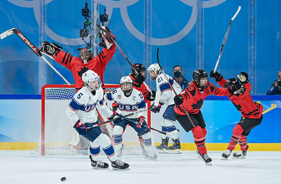 当日,在五棵松体育中心举行的北京2022年冬奥会女子冰球金牌赛中,加拿大队以3比2战胜美国队,获得冠军。