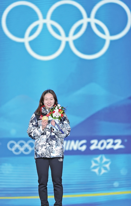 2月17日,冠军韩国选手崔敏静在奖牌颁发仪式上。