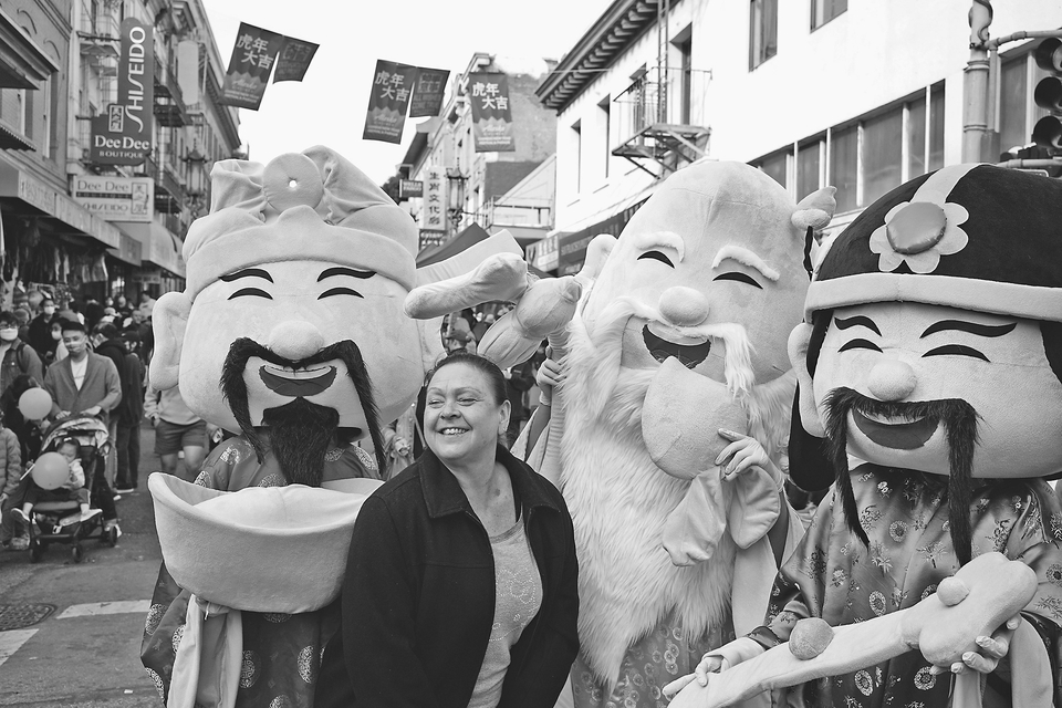 2月20日,在美国旧金山唐人街的周末集市上,游客与“福禄寿三星”合影。