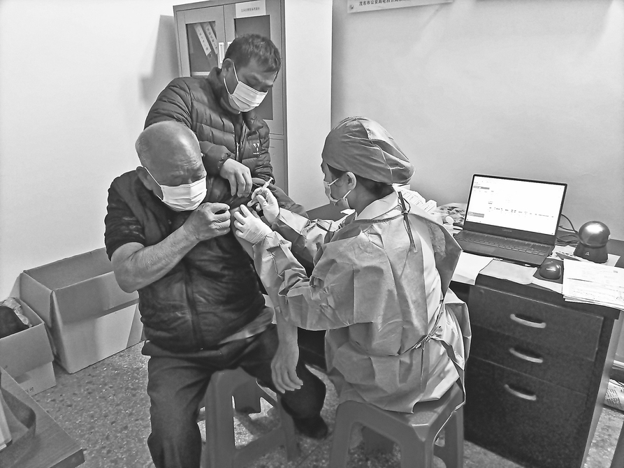 在接种现场,等候区、测温区、登记区、体检区、接种区、留观区等区域划分科学明确。镇村干部积极维护秩序,做好后勤保障。卫生院工作人员为前来接种疫苗的老年群众测量体温和血压,询问基础疾病和流行病学史,认真登记身份信息,详细讲解疫苗接种流程,耐心回答群众关注问题。在镇、村、卫生院三方通力合作下,疫苗接种工作有序、快速推进(如右图)。