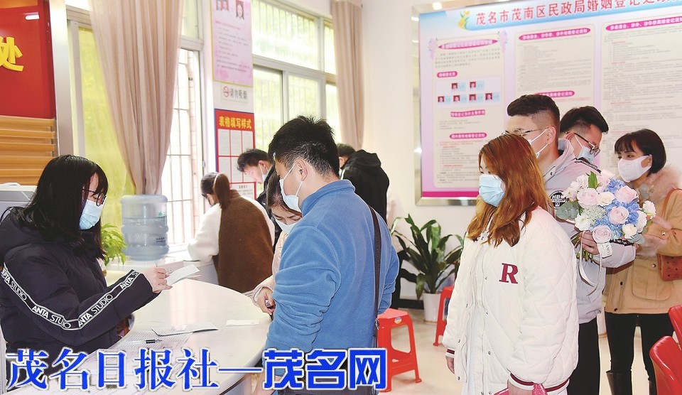 昨日一早,记者在茂南区民政局婚姻登记处看到,办证大厅秩序井然,准新人们脸上洋溢着幸福的笑容,他们按照网上预约的时间有序排队、填写资料、复印证件、等候办证等。不少准新人准备了美丽的鲜花,还特意穿上了情侣装,仪式感满满。一位刚领证的新人笑着说:“我老婆提出2022年2月22号这个日期特别好记,而且也是爱意满满的意思,所以就选了这个日子来登记,没想到今天会这么火爆。”
