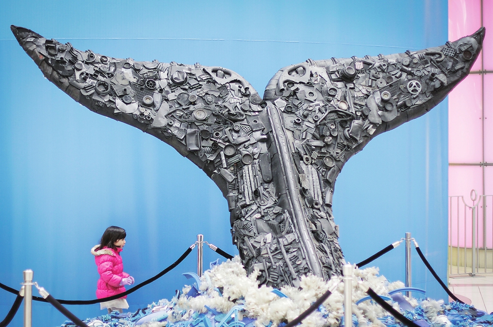 这是2月23日在加拿大伯纳比举行的“冲上海岸”艺术展上拍摄的参展作品。 该展览上的作品全部由从海洋中收集的塑料垃圾制成,旨在使参观者了解海洋生态污染的严重性和减少海洋塑料垃圾的重要性。展览将持续至4月30日。新华社发(梁森摄)