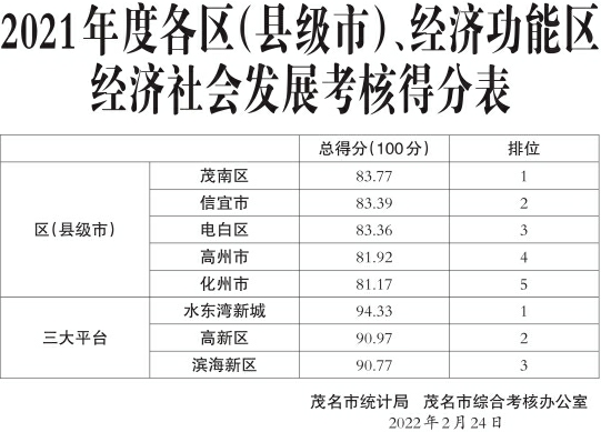2021年度各区(县级市)、经济功能区经济社会发展考核得分表