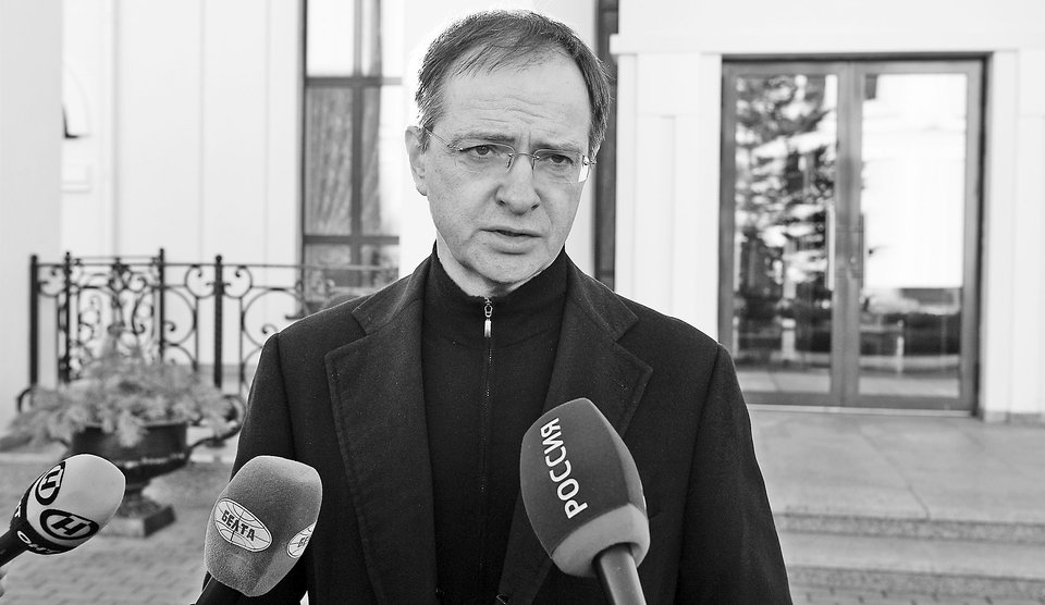 2月28日,俄罗斯代表团团长梅金斯基在白俄罗斯戈梅利州接受媒体采访。 新华社/卫星社