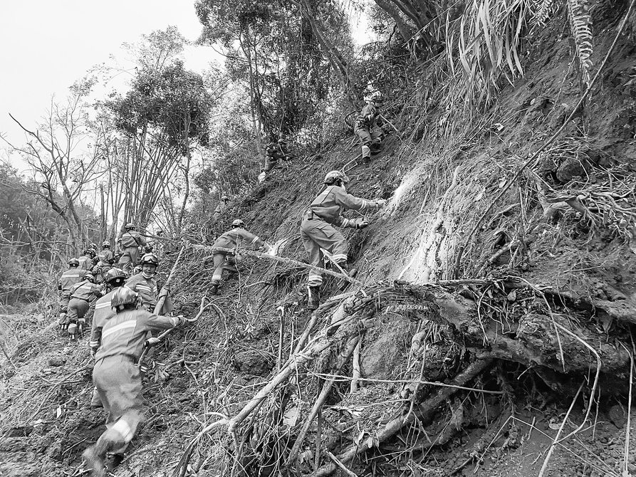 21日15时50分,梧州市藤县消防救援大队首战力量到达现场。广西消防救援总队总队长郑西介绍,消防救援人员携带救生工具分3个小组对核心区进行拉网式搜索。同时,组织专职消防队员对周边20公里范围进行搜索排查。22日,又组织了200人继续开展区域拉网排查。