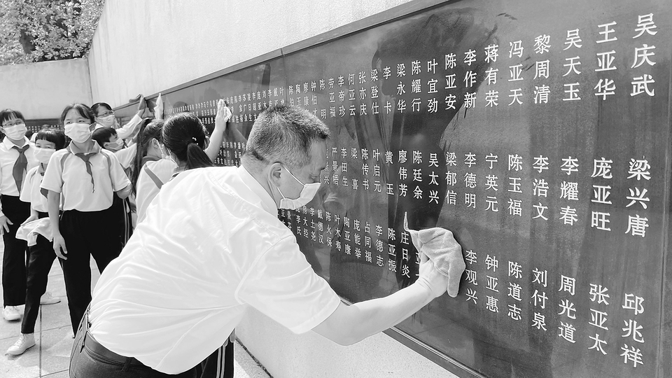 当天,烈属代表、参战老兵代表、师生代表等到市烈士陵园拜祭英烈。他们用心擦拭革命烈士纪念碑、英名墙(见右图),并向革命烈士敬献鲜花、鞠躬致敬,深刻缅怀舍生取义、为国捐躯、为民牺牲的烈士们。活动期间,茂南区袂花镇顿标小学的学生代表宣读了祭文,少先队员们献唱《我们是共产主义接班人》,表达新时代少年为实现中华民族伟大复兴的中国梦不懈奋斗的坚定决心,立志传承红色基因。