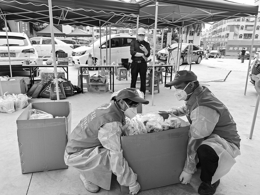 李德杰和妻子蔡碧贻原是名爱总队星愿志愿者服务队的队员。一直以来,他们夫妇都热衷于志愿服务。此次在抗疫的路上,他们再次携手,并肩作战。在征集到几名在防范区内的志愿者后,李德杰听从安排,带队前往位于碧桂园大名府(东门)的志愿服务点,承担起为封控在内的居民运送物资的重任。“怕是肯定怕的,我们这里的工作人员与封控在里面的居民就一墙之隔,但我们知道他们需要我们,我们不能退缩。”李德杰告诉记者,他们主要负责为封控的居民跑腿,解决他们的各类物资需求。