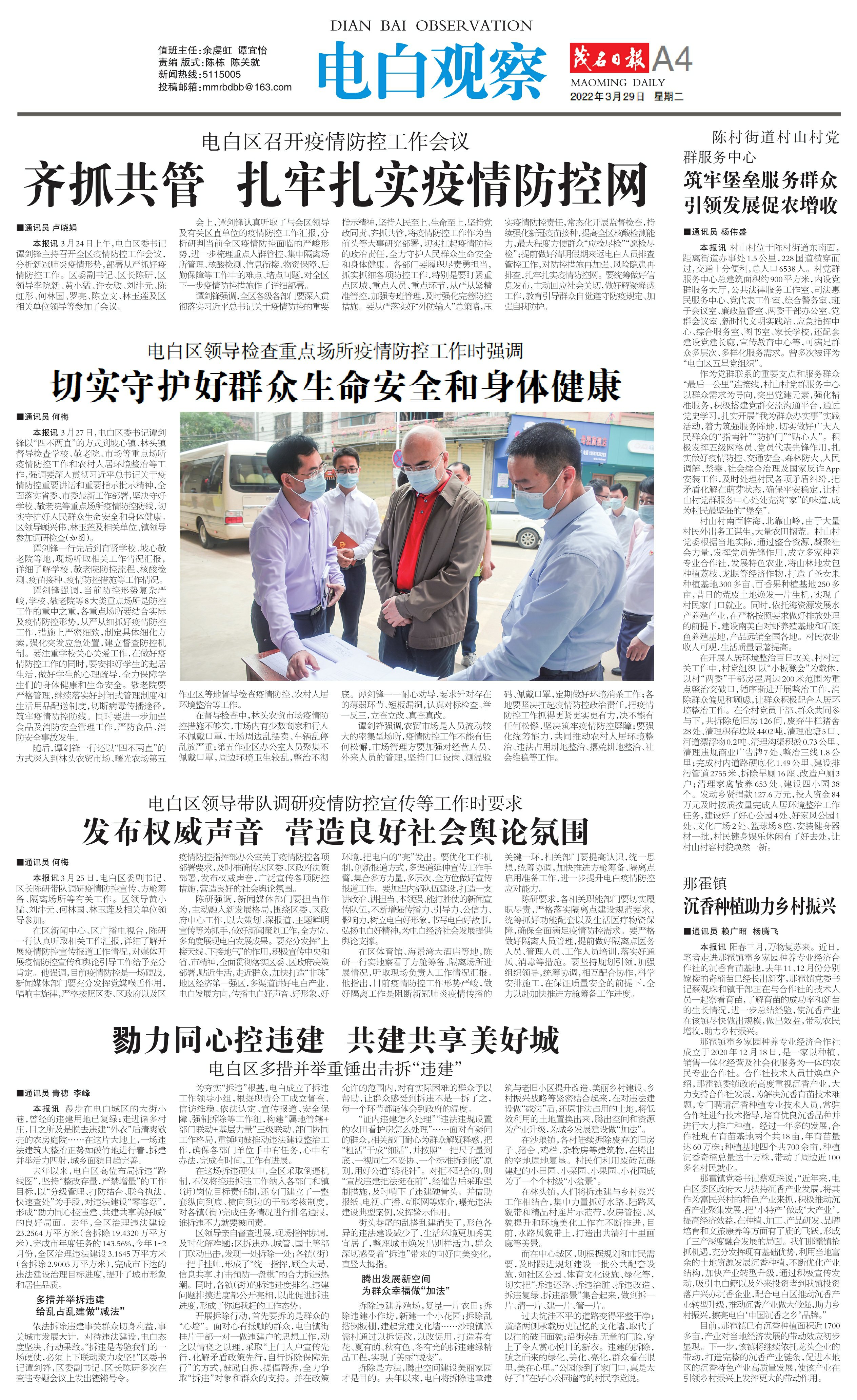 依法拆除违建事关群众切身利益,事关城市发展大计。对待违法建设,电白态度坚决、行动果敢。“拆违是考验我们的一场硬仗,必须上下联动聚力攻坚!”区委书记谭剑锋,区委副书记、区长陈研多次在查违专题会议上发出铿锵号令。
