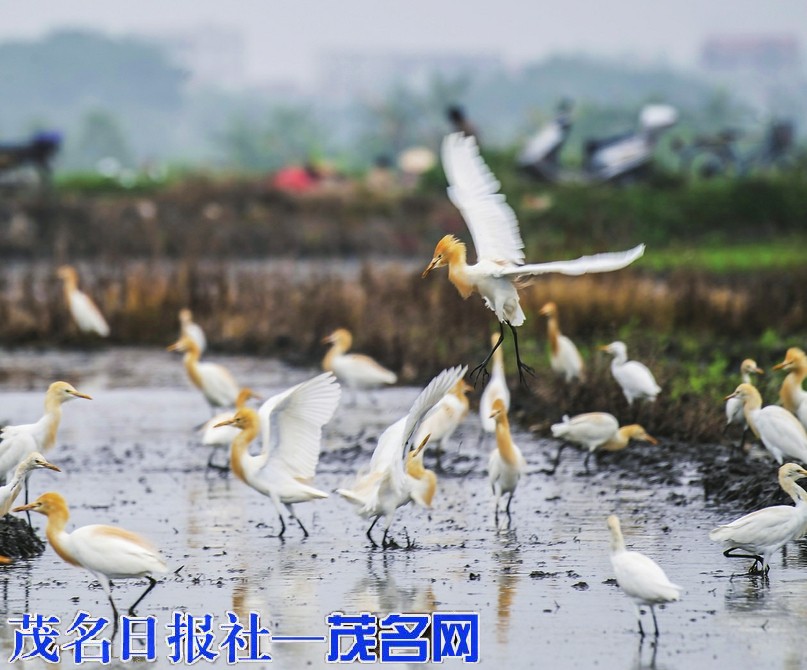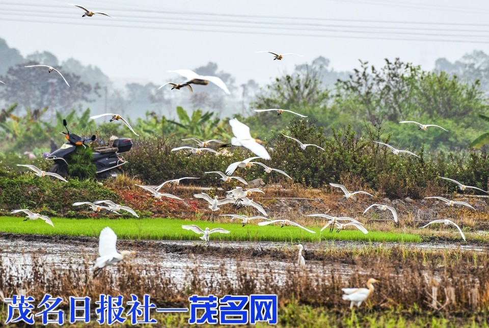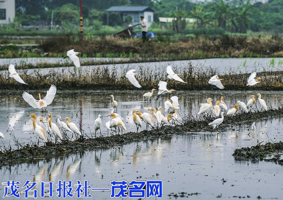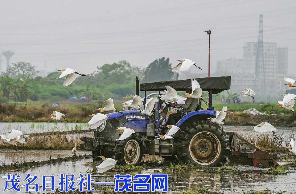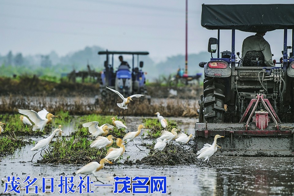 近日来,茂南区金塘镇Y188乡道两旁,村民忙着耙田插秧,绿意盎然的市郊生态,繁忙的春耕生产,白鹭跟着觅食嬉戏,人鸟和谐相处,呈现一幅白鹭闹春耕的田园美景。