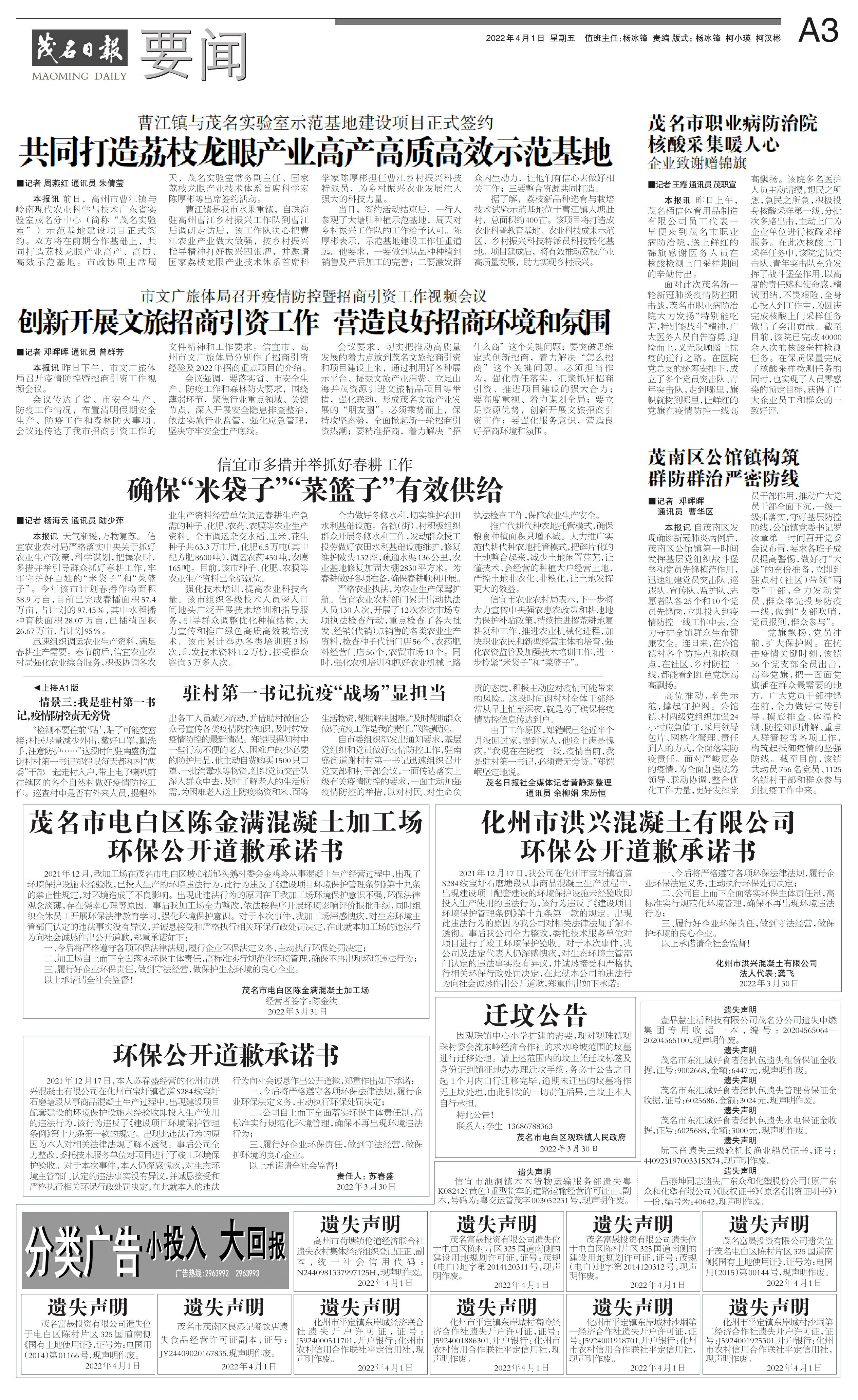 本报讯前日,高州市曹江镇与岭南现代农业科学与技术广东省实验室茂名分中心(简称“茂名实验室”)示范基地建设项目正式签约。双方将在前期合作基础上,共同打造荔枝龙眼产业高产、高质、高效示范基地。市政协副主席周天,茂名实验室常务副主任、国家荔枝龙眼产业技术体系首席科学家陈厚彬等出席签约活动。