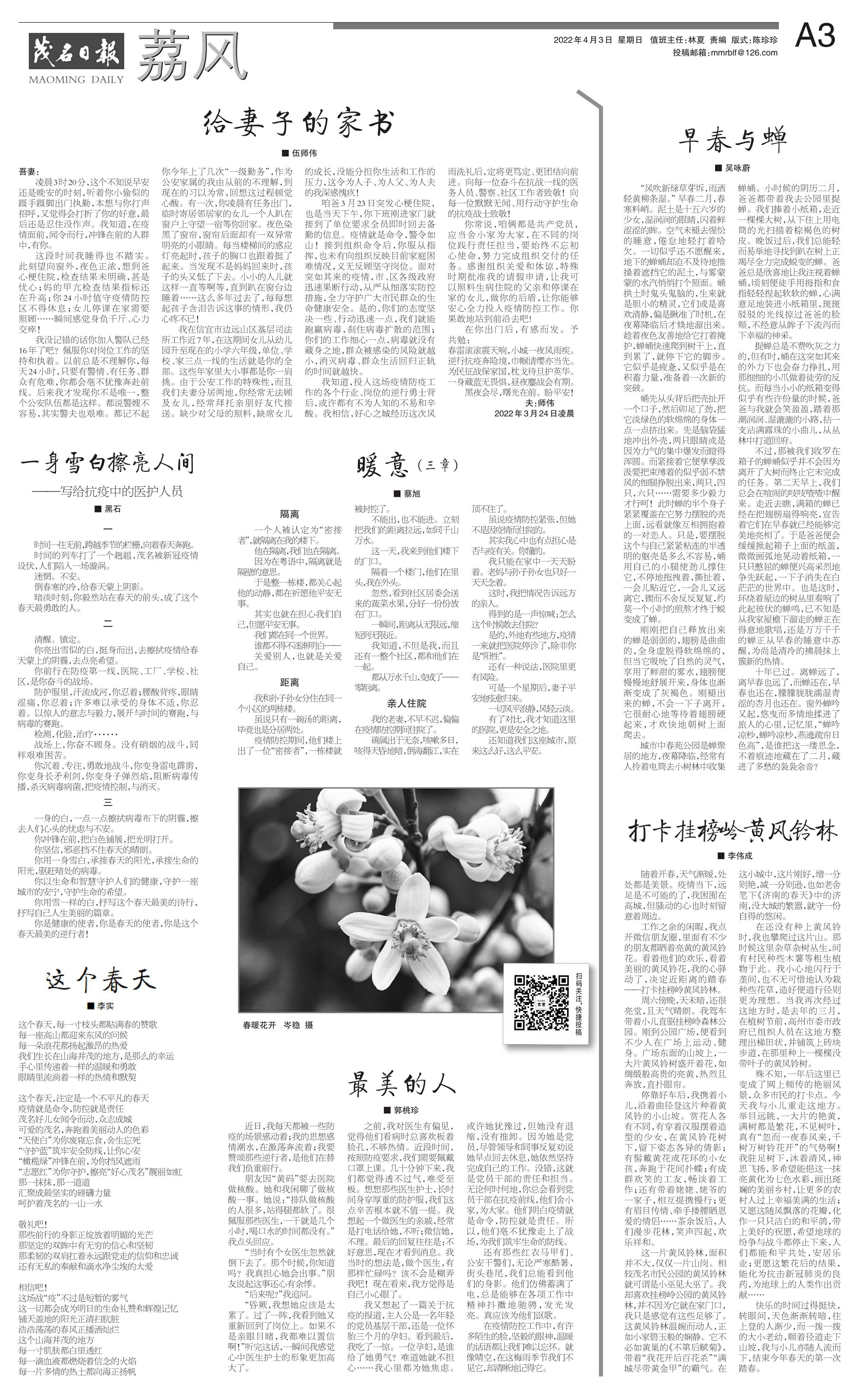 清醒。镇定。你亮出雪似的白,挺身而出,去擦拭疫情给春天蒙上的阴霾,去点亮希望。