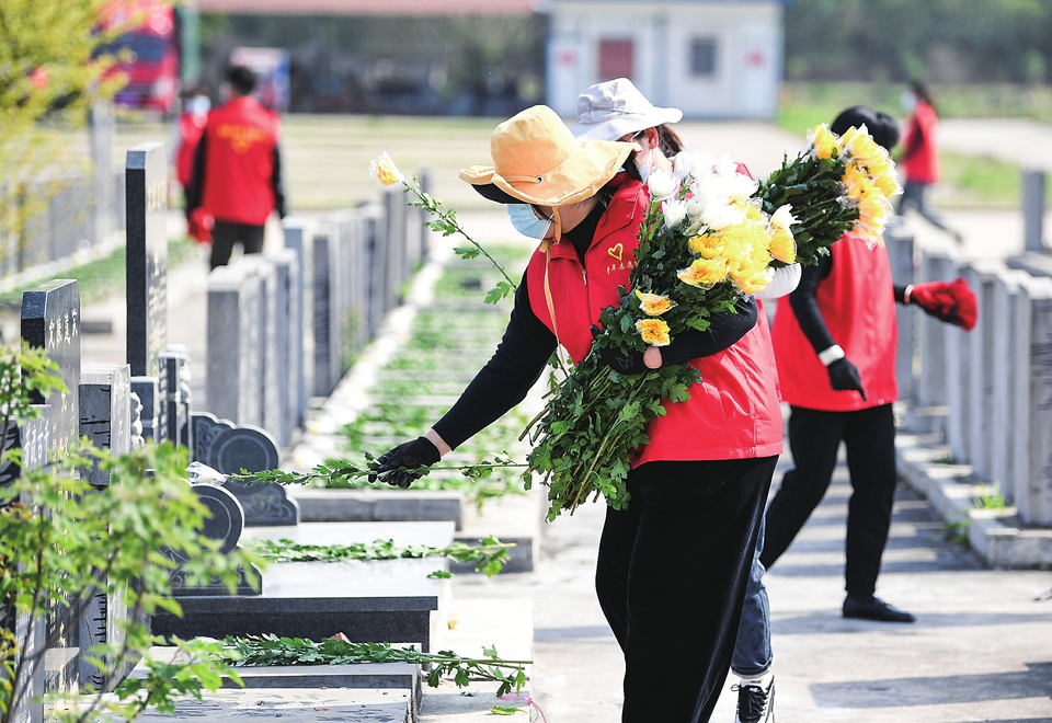 4月2日,合肥市肥西县花岗镇志愿者在辖区公墓开展代祭扫。 新华社发(马家贵摄)