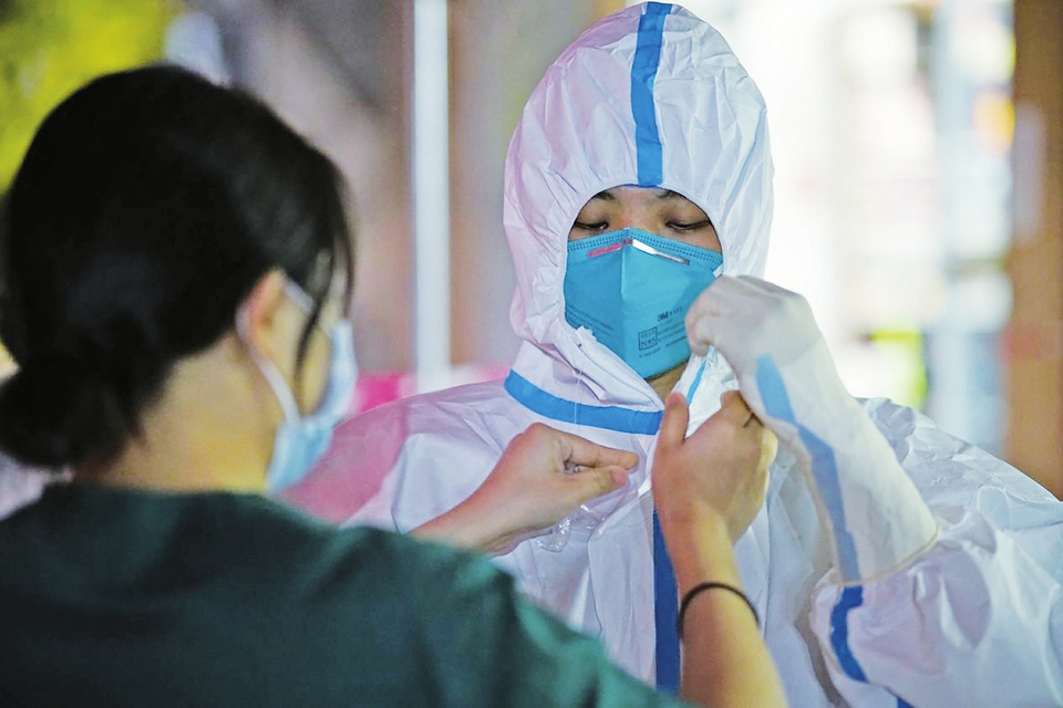 医疗支援队成员穿上防护服准备工作。
