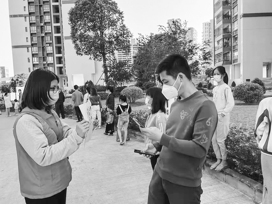 “请你出示健康码,48小时内接种疫苗的暂时不能做核酸检测。”志愿者们分工合作,以全区100多个核酸采样点为阵地,全区4000多名党员志愿者以不少于10人一组,按单位分批分时段到点开展工作。他们搬桌椅、拉警戒线,提醒群众正确戴口罩……几乎同一时段,每一个采样点都活跃着志愿者忙碌的身影。随处可见志愿者对前来候检的人员进行初步测量体温,引导他们间隔一米距离排好队伍,向候检人员逐个出示粤核酸二维码;对老年人或不太熟悉智能手机的群众,则耐心指导填写。
